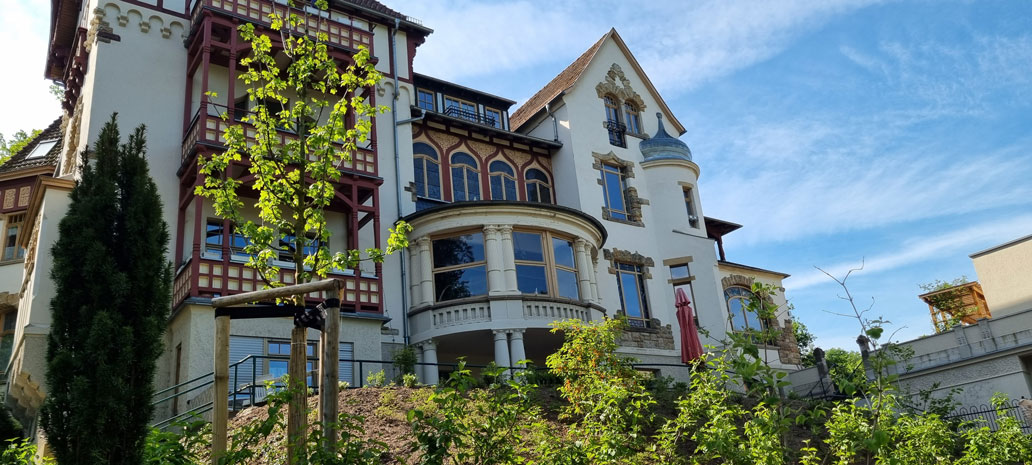 Über die Rückseite des Gebäudes haben Sie Zugang zum Garten und der schönen Terrasse an der Villa Felseneck.